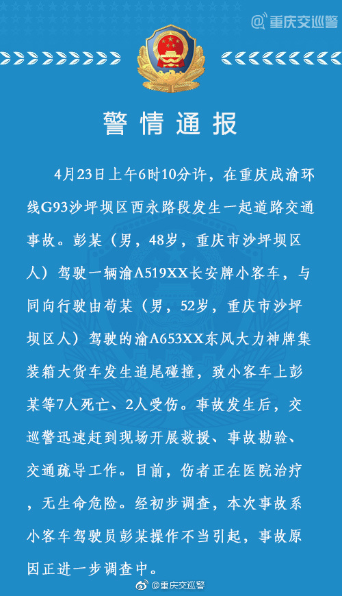 4月23日上午6时10分许,在重庆成渝环线G93沙坪坝区西永路段发生一起道路交通事故。彭某(男,48岁,重庆市沙坪坝区人)驾驶一辆渝A519XX长安牌小客车,与同向行驶由苟某(男,52岁,重庆市沙坪坝区人)驾驶的渝A653XX东风大力神牌集装箱大货车发生追尾碰撞,致小客车上彭某等7人死亡、2人受伤。