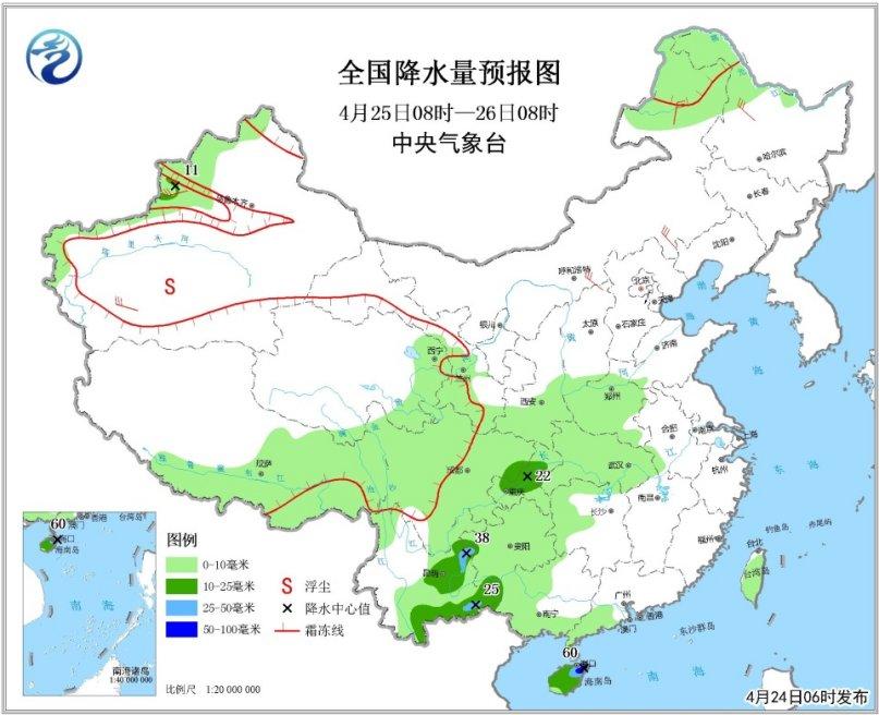 4月24日08时至25日08时,甘肃南部、陕西南部、川西高原北部、四川盆地东部、重庆西部、贵州西北部和南部、云南东部、广西西北部、广东南部、海南岛、青藏高原东部和东南部等地有中到大雨,其中,四川盆地东部等地局地有暴雨(50~70毫米),上述局地并将伴有短时强降水、雷暴大风或冰雹等强对流天气。南疆盆地等地的部分地区有扬沙或浮尘。
