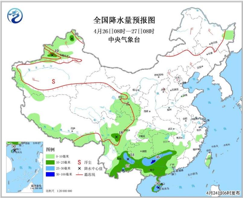 4月26日08时至27日08时,新疆北部和伊犁河谷,川西高原、云南东部、贵州南部、湖南南部、广西大部、广东西部、海南岛等地的部分地区有中到大雨,其中,广西北部和海南岛局地有暴雨(50~56毫米),上述局部地区将伴有短时强降水、雷暴大风等强对流天气。新疆北部、内蒙古中东部、黑龙江、辽宁、华北中北部等地有4~6级风;新疆南疆盆地的部分地区有扬沙或浮尘。