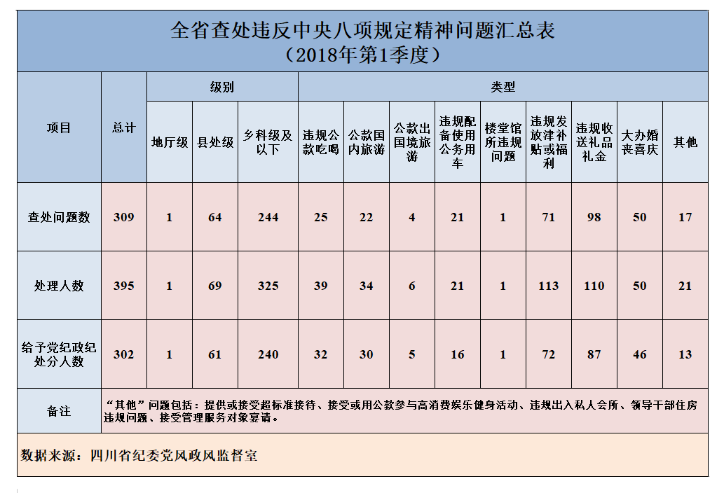从第一季度公开的数据来看,四川省查处违反中央八项规定精神问题数309起,处理395人。因违反中央八项规定精神受到党纪政务处分的干部有302人,其中地厅级干部1人,县处级干部61人,继续保持高压态势。