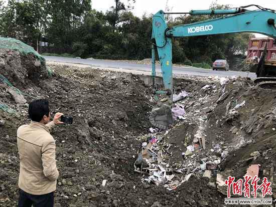 “这不是胡说吗?底下还有垃圾。他们倒了多少来,我一清二楚,都是有视频为证的。”干昌友当晚就领着村民拦下了挖掘机。他因此又受到威胁,温江区下派的调研员称“干昌友阻碍施工,底下如果没有垃圾了,要追究责任。”最后,邻居开着挖掘机,从下面又清出了近10车垃圾。